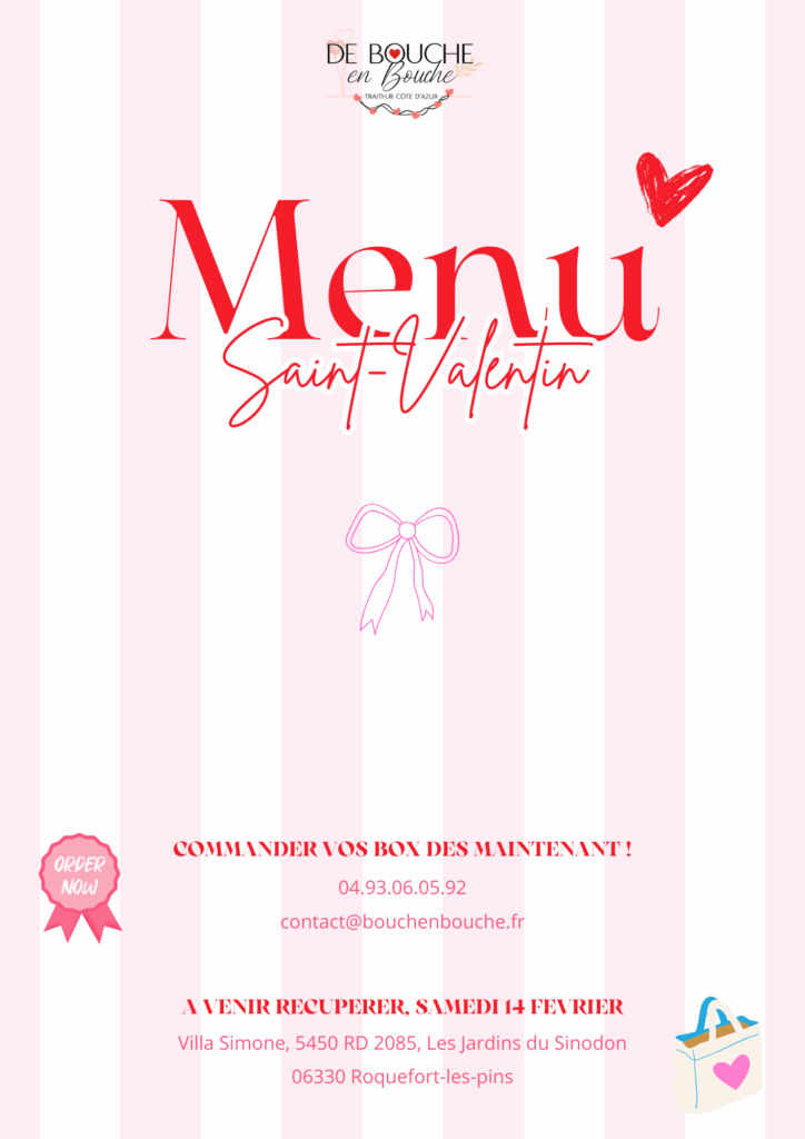 Pour célébrer l’amour (et la bonne cuisine !), notre équipe vous a préparé un menu spécial Saint-Valentin, pensé pour un moment gourmand et plein de douceur.